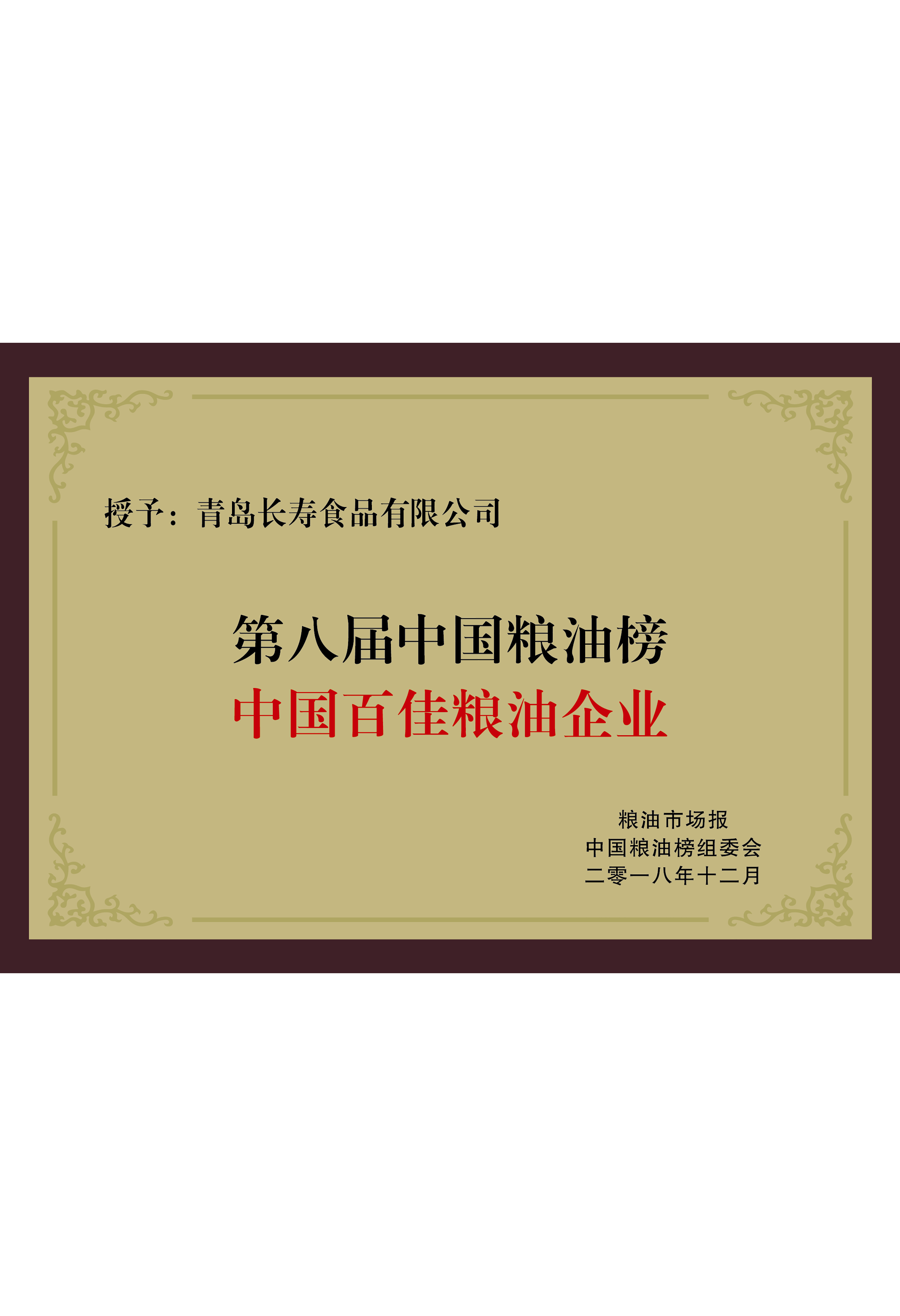 2018年12月 榮獲“中國(guó)百佳糧油企業(yè)”稱號(hào),同時(shí)還榮獲“中國(guó)十佳糧油優(yōu)質(zhì)特色產(chǎn)品”榮譽(yù)稱號(hào)